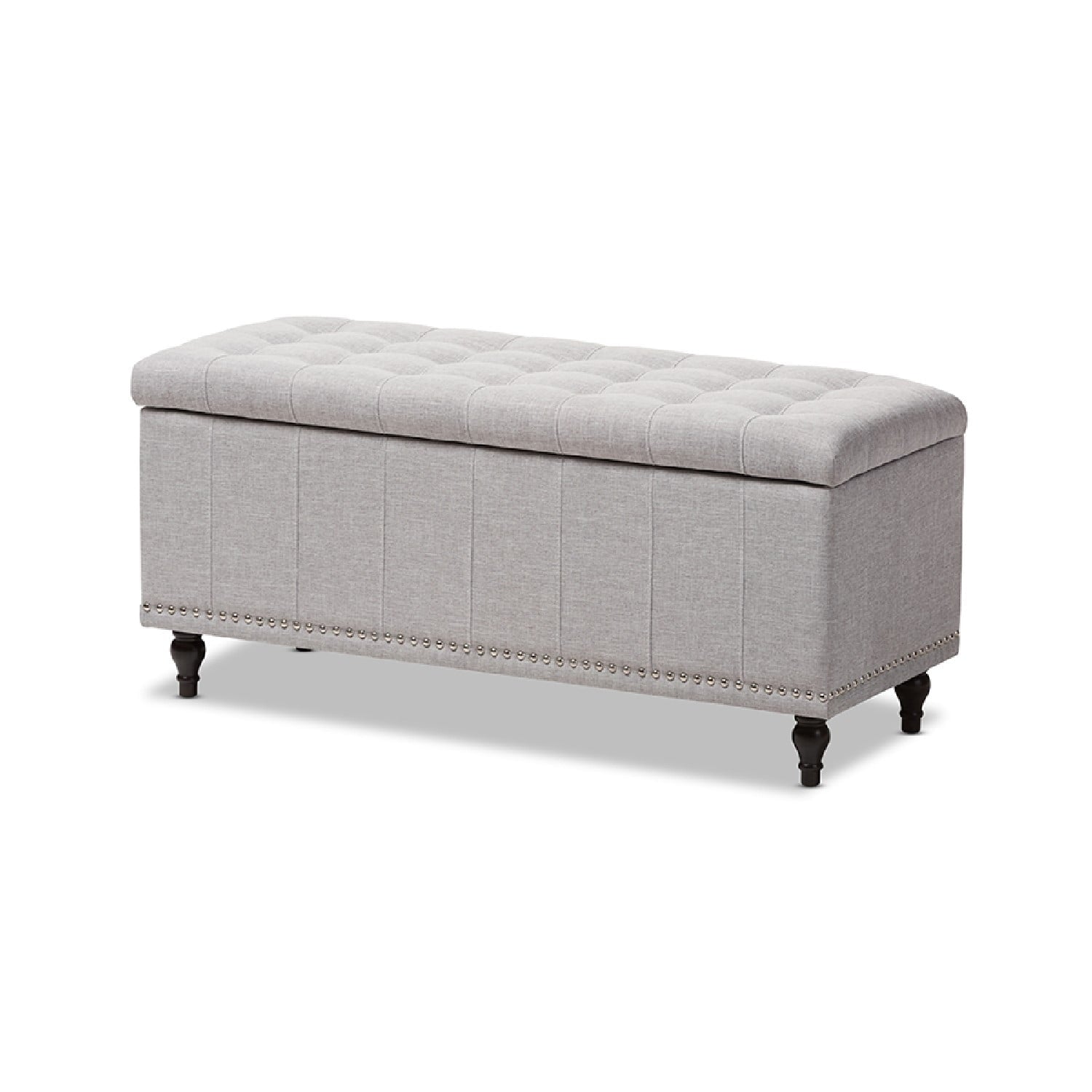 Baxton Studio Kaylee Modern Classic Dark Grey Fabric Upholstered Button-Tufting Storage Ottoman Bench Whether paired with upholstered bed as a bed end bench or simply on its own, this modern classic button-upholstered storage ottoman offers classic and smart interiors styling with practical internal storage that will work in any room. Add an on-trend neutral accent to a simple white room, the Kaylee storage ottoman bench is upholstered in polyester fabric available in your choice of beige, greyish beige, dark grey or light blue color for a neutral or statement look. Constructed of solid rubberwood frame and feet, the Kaylee is built to last. The ottoman box opens up to reveal internal storage for blankets and bed linen. Softly padded, the top of the lid features button-tufting with grid lines while the sides are trim with silver nail heads for a modern look. For refined elegance, the detailed stitching on all sides and the classic feet complete the look. Made in Malaysia, the Kaylee storage ottoman bench requires minor legs assembly
