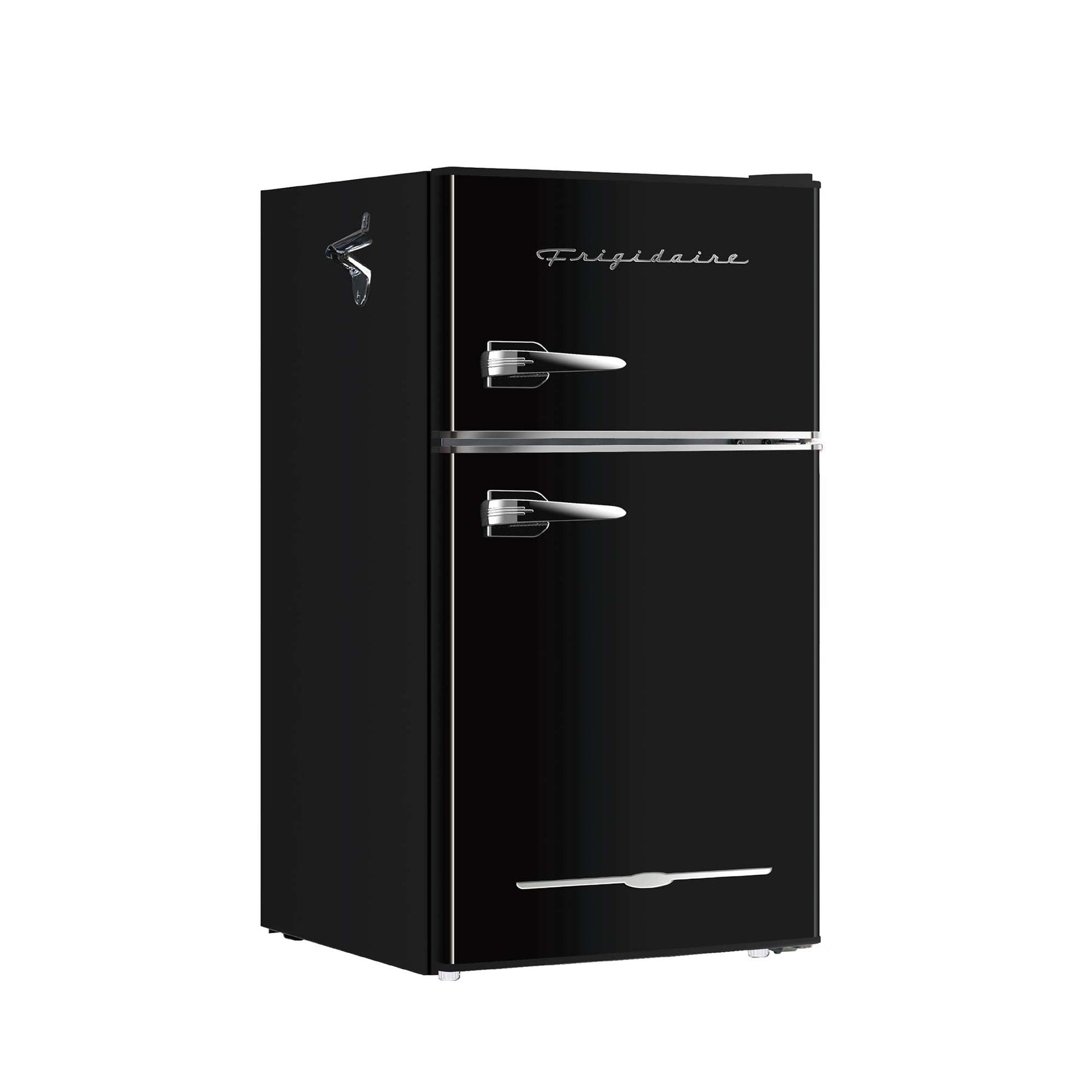Ensure that your favorite snacking foods, drinks, and frosty treats stay cold with the Retro Mini Fridge and Freezer Unit from Frigidaire. Ideal for both food and drink storage, this 2 door combo fridge, and freeze has separate space for a variety of items. Featuring a spacious 3.1-cubic-foot interior with 2 adjustable sliding glass shelves and a pull-out crisper bin, the storage opportunities become endless. No longer will you have to make multiple trips to get what you need. When you open the door, an interior light turns on to illuminate the contents of the refrigerator. With the adjustable 7-setting temperature control dial, you'll be able to keep your food chilled to just the right temperature. Measuring 21 inches deep, 19 inches wide, and 33 inches tall, this retro mini fridge is an ideal addition to any home or office. Conveniently, this unit includes a built-in bottle opener on the side to accommodate any drink you need. Enjoy a cold drink accompanied by your favorite snack at any time, thanks to the Retro Mini Fridge and Freezer from Frigidaire.