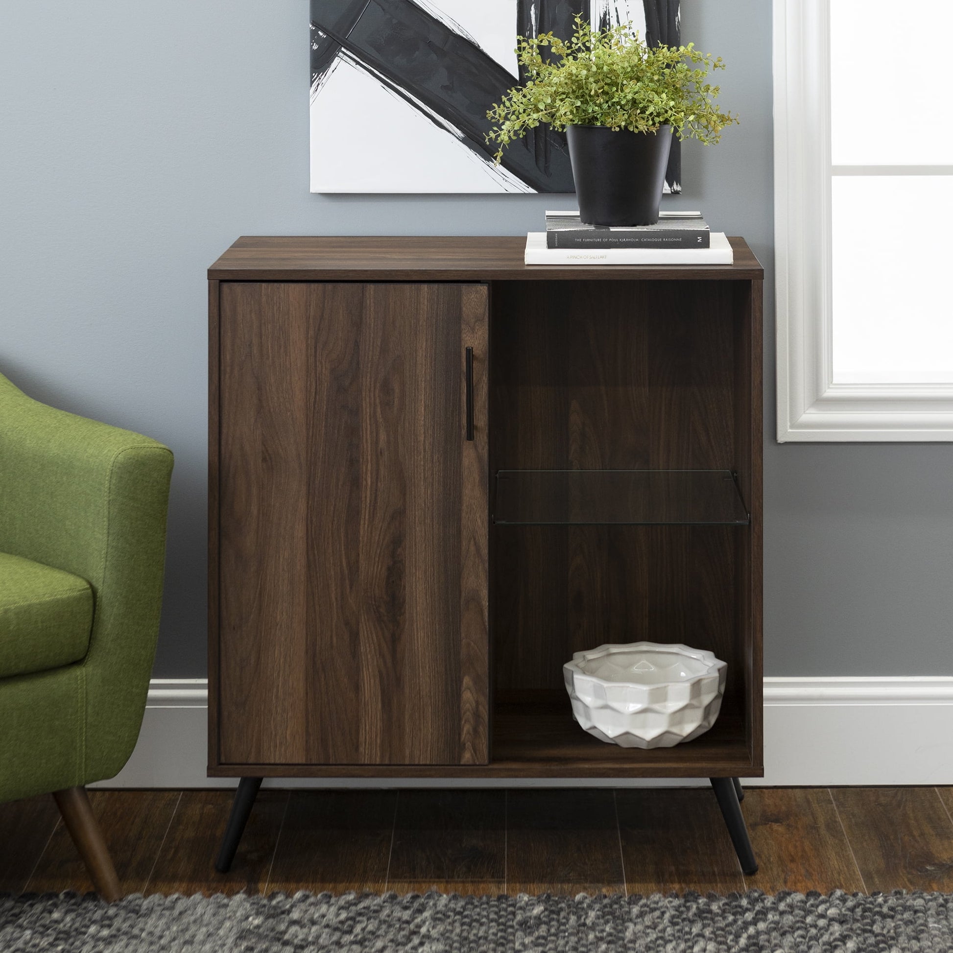 Perfect for additional storage space, this accent cabinet from Manor Park is ideal for your space. With a versatile design, you can use as a buffet in your dining room for additional plates and glasses, as a TV stand supporting up to a 32-inch TV in your living room, or a bar cabinet to put your drinks on display. Featuring angled metal legs, a sleek metal handle, a glass shelf, and a high-grade MDF, laminate construction in a mid century modern and transitional design style. Providing you with both open and closed storage to give you the option to showcase your items and hide away others. Style the table top with your favorite plants, pictures, candles, and more for an entryway table. You’ll love having such a multi-functional piece in your home to decorate and give you additional storage space.